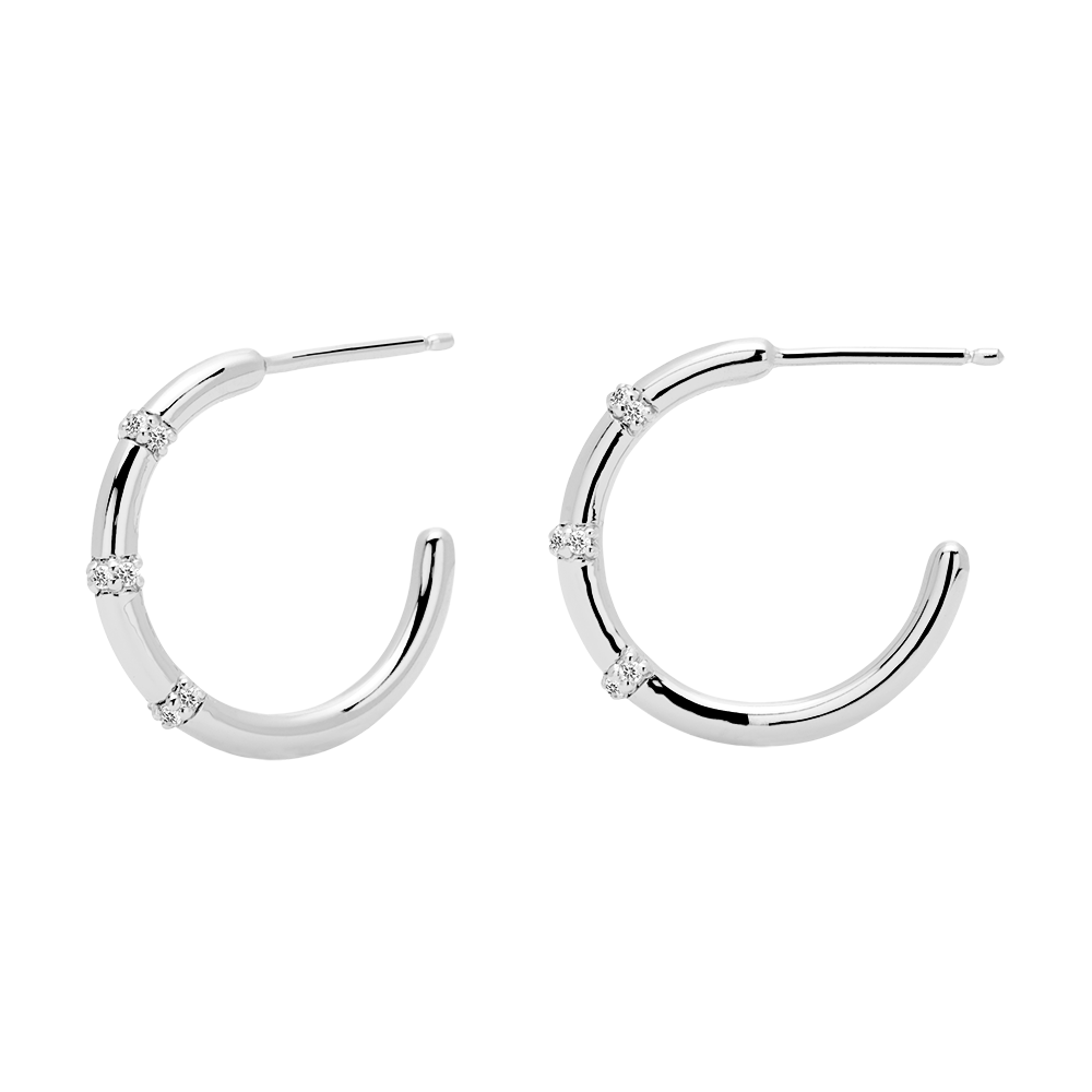 Silber-Ohrringe sind ein minimalistischer Ansatz der anspruchsvollen, weiblichen Hollywood-Stars der 70er Jahre. Weiße Zirkonia verkörpern Eleganz als Geisteshaltung, während sie dieses feine Design aus 925er Sterlingsilber, das in Handarbeit poliert wurde, verzieren. Schmuck, der ganz von alleine glänzt und es wagt Konventionen zu brechen.