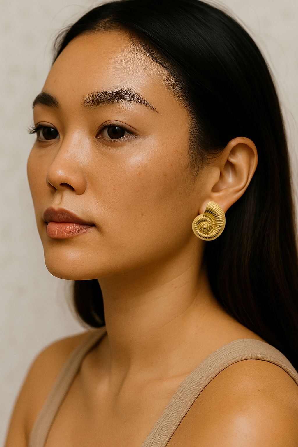 Diese eleganten Ohrringe in Form einer kunstvoll gearbeiteten Spirale erinnern an die Schönheit von Muscheln und fossilen Ammoniten. Gefertigt aus robustem Edelstahl und edlem Messing, sind sie mit einer hochwertigen 18k Vergoldung veredelt – das Gold stammt zu 100 % aus recycelten Quellen.