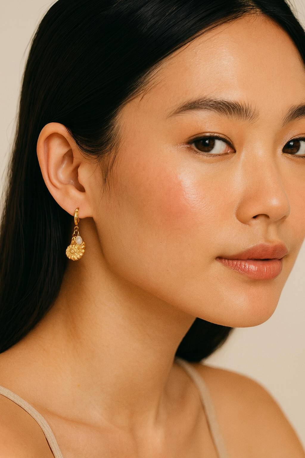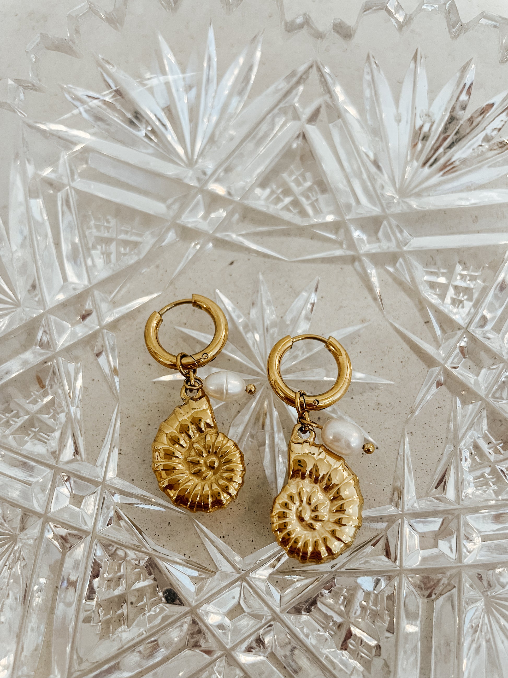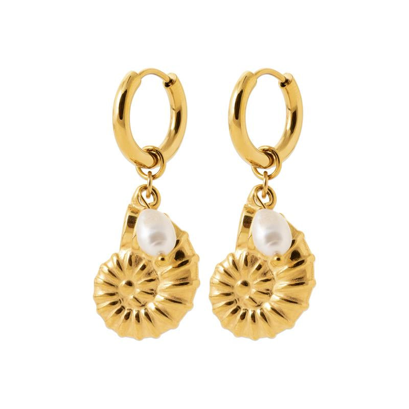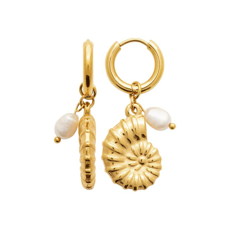 Diese eleganten Ohrringe in Form einer kunstvoll gearbeiteten Spirale und schimmernden Süsswasserperlen erinnern an die Schönheit von Muscheln und fossilen Ammoniten. Gefertigt aus robustem Edelstahl und edlem Messing, sind sie mit einer hochwertigen 18k Vergoldung veredelt – das Gold stammt zu 100 % aus recycelten Quellen.
